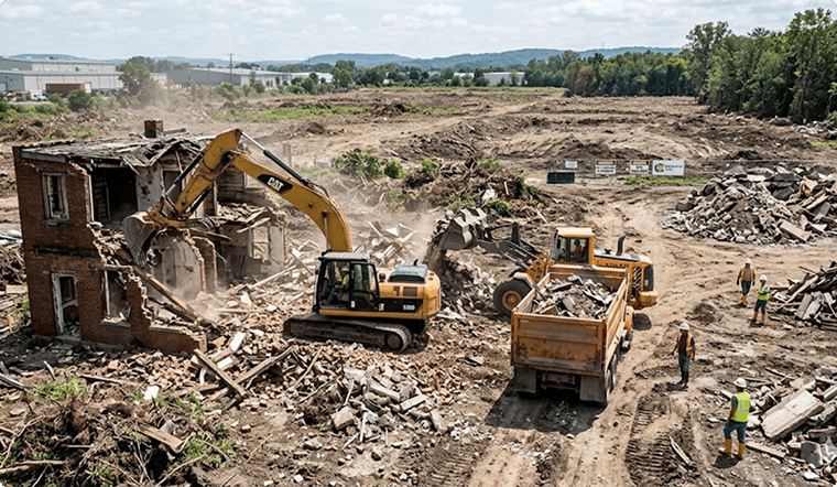 Old structures, debris, and unwanted growth are removed so the site is ready for construction.